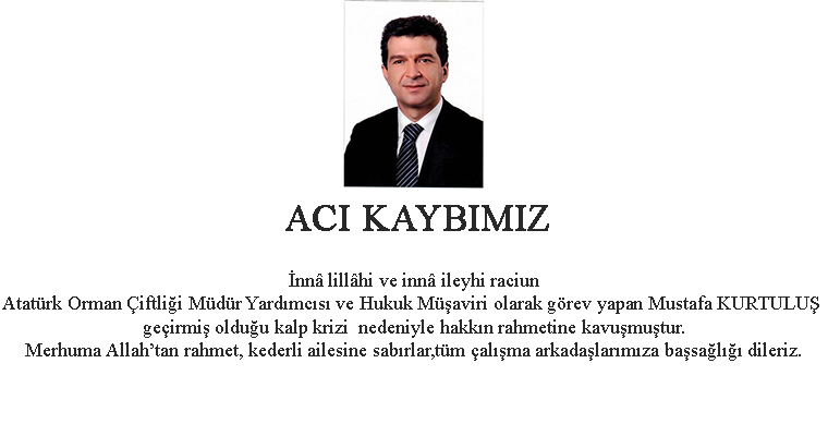 Atatürk Orman Çiftliği Müdür Yardımcısı ve Hukuk Müşaviri olarak görev yapan Mustafa KURTULUŞ geçirmiş olduğu kalp krizi  nedeniyle hakkın rahmetine kavuşmuştur.Merhuma Allah’tan rahmet, kederli ailesine sabırlar,tüm çalışma arkadaşlarımıza başsağlığı dileriz.